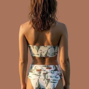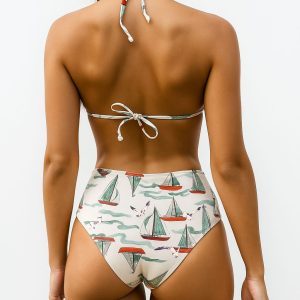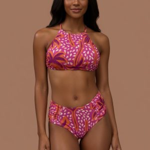 Top frente única com bojo e costas com fechamento por amarração. Calcinha cós alto com franzido nas laterais.