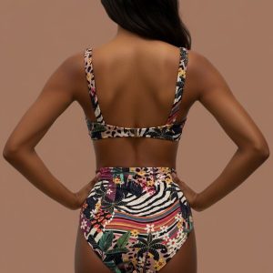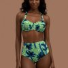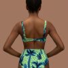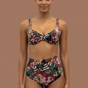 Top sem bojo, com aro, alças largas reguláveis e fechamento com gancho niquelado dourado. Calcinha cós alto com pala que permite modelar a silhueta.