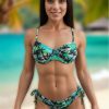 Top sem bojo, com aro, alças largas reguláveis e fechamento com gancho niquelado dourado. Calcinha cós alto com pala que permite modelar a silhueta.