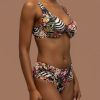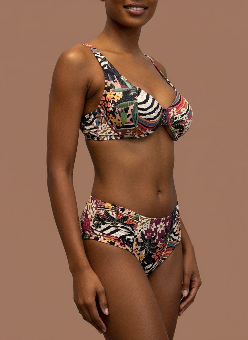Top faixa com bojo e alças removíveis. Calcinha cós alta com pala que permite modelar a silhueta.