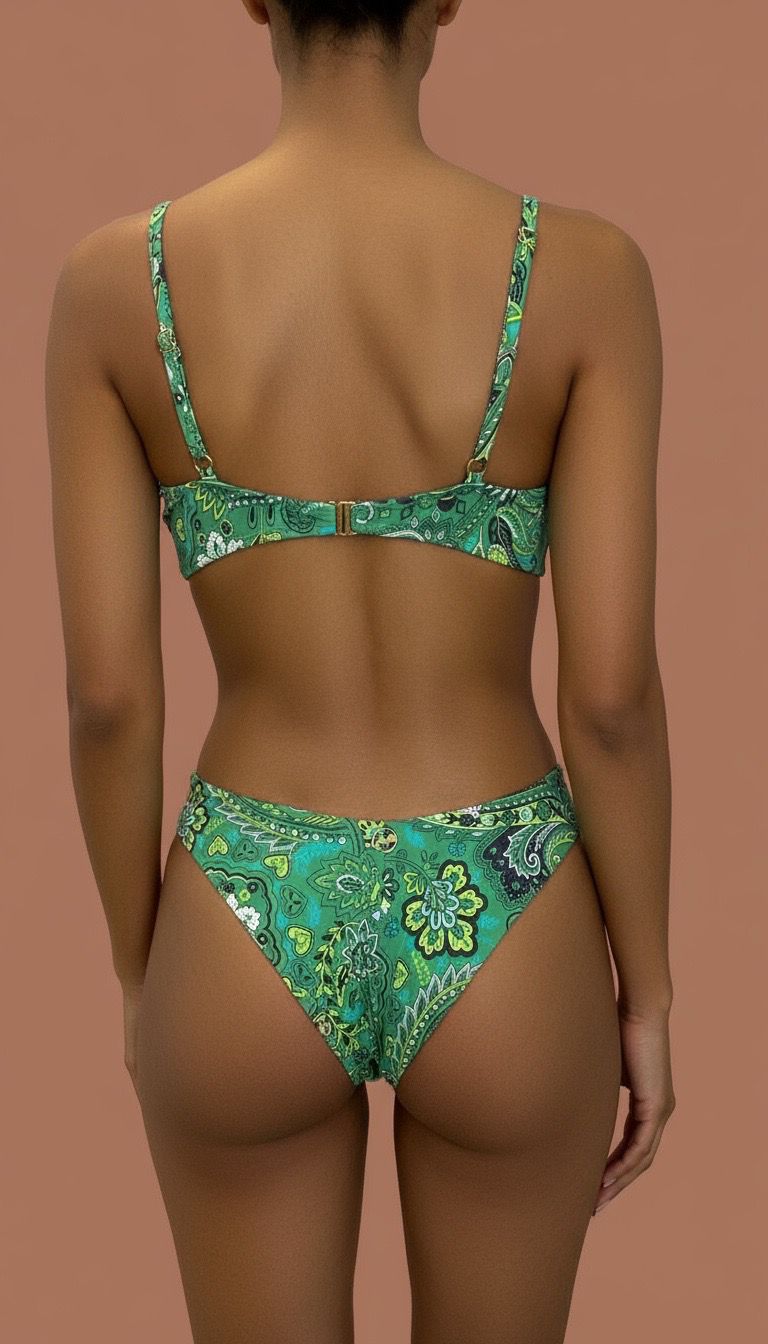 Top com bojo, alças reguláveis e fechamento por gancho niquelado dourado. Calcinha cós alto com pala que permite modelar a silhueta.